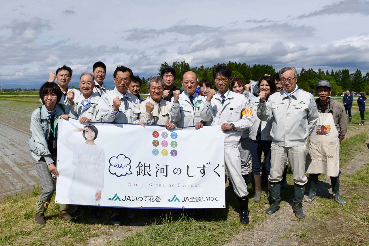 JAいわて花巻は5月14日、岩手県オリジナル水稲品種「銀河のしずく」の田植え式を岩手県花巻市鍋倉の農事組合法人「なべくら」の水田で開きました。
