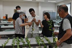 同日は、県中部農業改良普及センターの職員が出荷時期の管理について説明を行い、植穴の除草や水管理の徹底を呼び掛けました。また、株養成のため、支柱やネットを設置して茎折れを防ぎ、収穫しない花は早めに折り取るよう話しました。