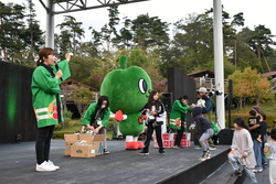 同日は、同施設の野外ステージ上でJA職員が「花巻産の農産物を知って、たくさん食べてください」と呼び掛け、ピーマン1袋と「紅いわて」が入った手提げ袋を100人に手渡しました。来場者は「ピーやん」と交流し写真を撮影するなどしてイベントを楽しみました。