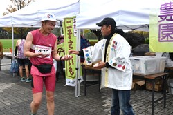 走り終えたランナーにおにぎりを手渡す千葉さん(右)