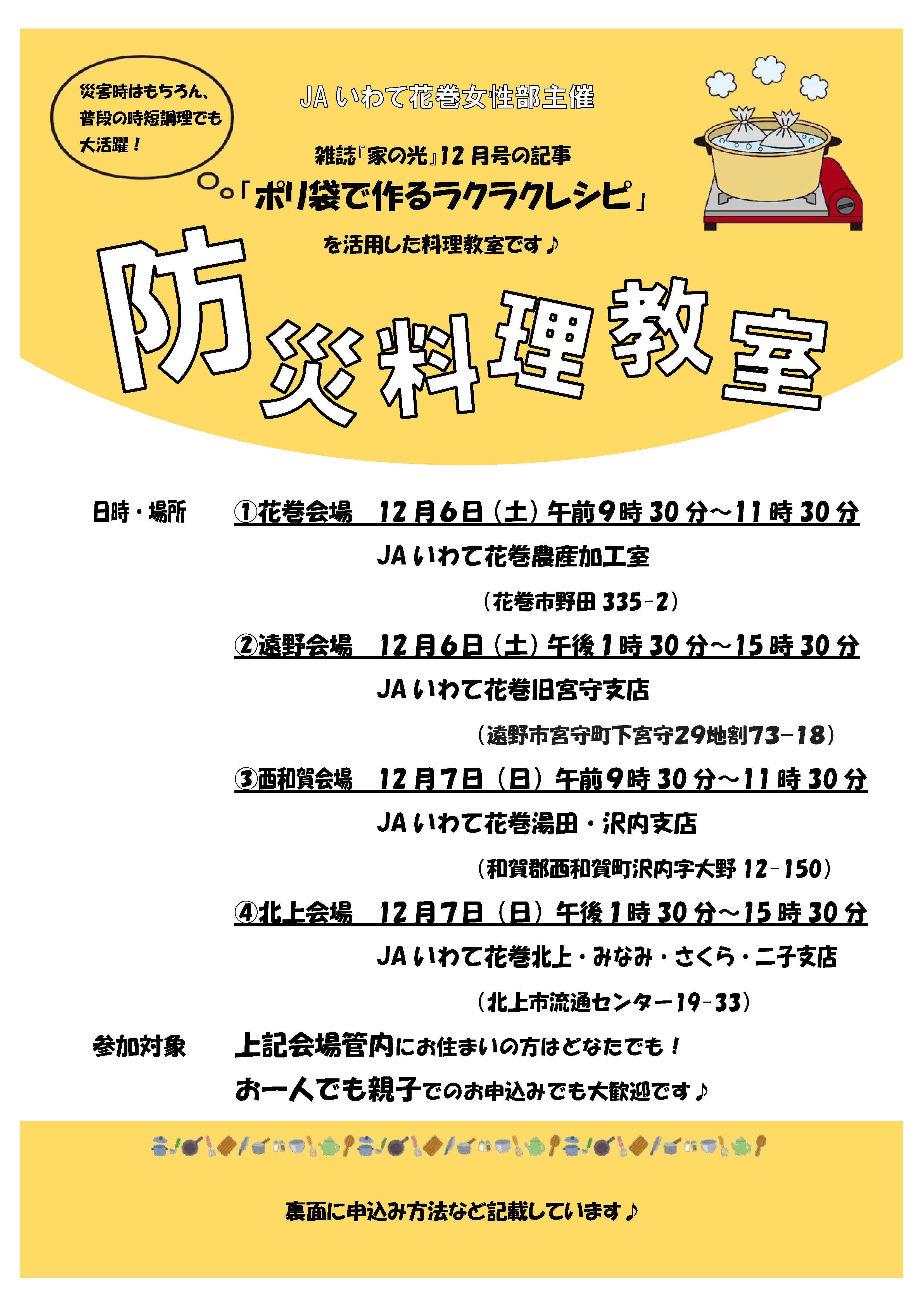 JAいわて花巻女性部では、災害時に役立つラクラク料理について学ぶことができる「防災料理教室」を、JA管内4会場で開催します♪