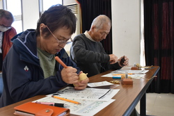 講習後、会員らは実際に同社の体験プログラム「ひょうたんランプ作り」に挑戦しました。きりを使用してひょうたんに穴をあけて模様を描き、オリジナルのランプを作りました。