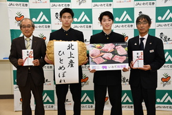 JAと全農いわては12月、全国大会に出場する黒沢尻工業高等学校バスケットボール部と専修大学北上高等学校男女サッカー部、吹奏楽部に「北上産ひとめぼれ」と「いわて純情豚」、金一封を贈呈し、大舞台での活躍を祈願しました。