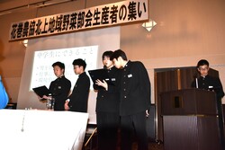 集いの最後には、北上市立和賀西中学校の生徒ら5人による活動発表が行われました。生徒らは、学習の中で地域の課題や魅力を調査し、地元の北上市和賀町で栽培が盛んなアスパラガスに着目。独自に研究を重ね、PR動画の作成やアスパラガスを使った料理レシピの考案を行いました。発表が終わると会場からは称賛の拍手が沸き起こり、生徒らを称えました。JA職員は「若い世代が地域の農産物を紹介してくれることで、さらなる生産販売の向上や地域の活性化につながる」と話しました。