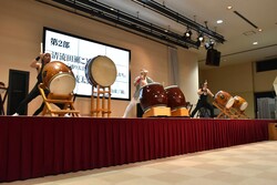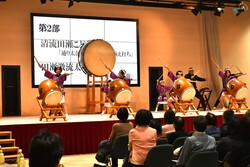 第2部では、花巻市東和町地域のスポーツ少年団として活動する「清流田瀬こども太鼓」とそのOBで構成された「田瀬激流太鼓の会」が太鼓演奏を披露しました。子供たちによる元気な演奏と、巨大な太鼓を叩く大人たちの迫力ある演奏に会場からは大きな拍手が沸き起こりました。