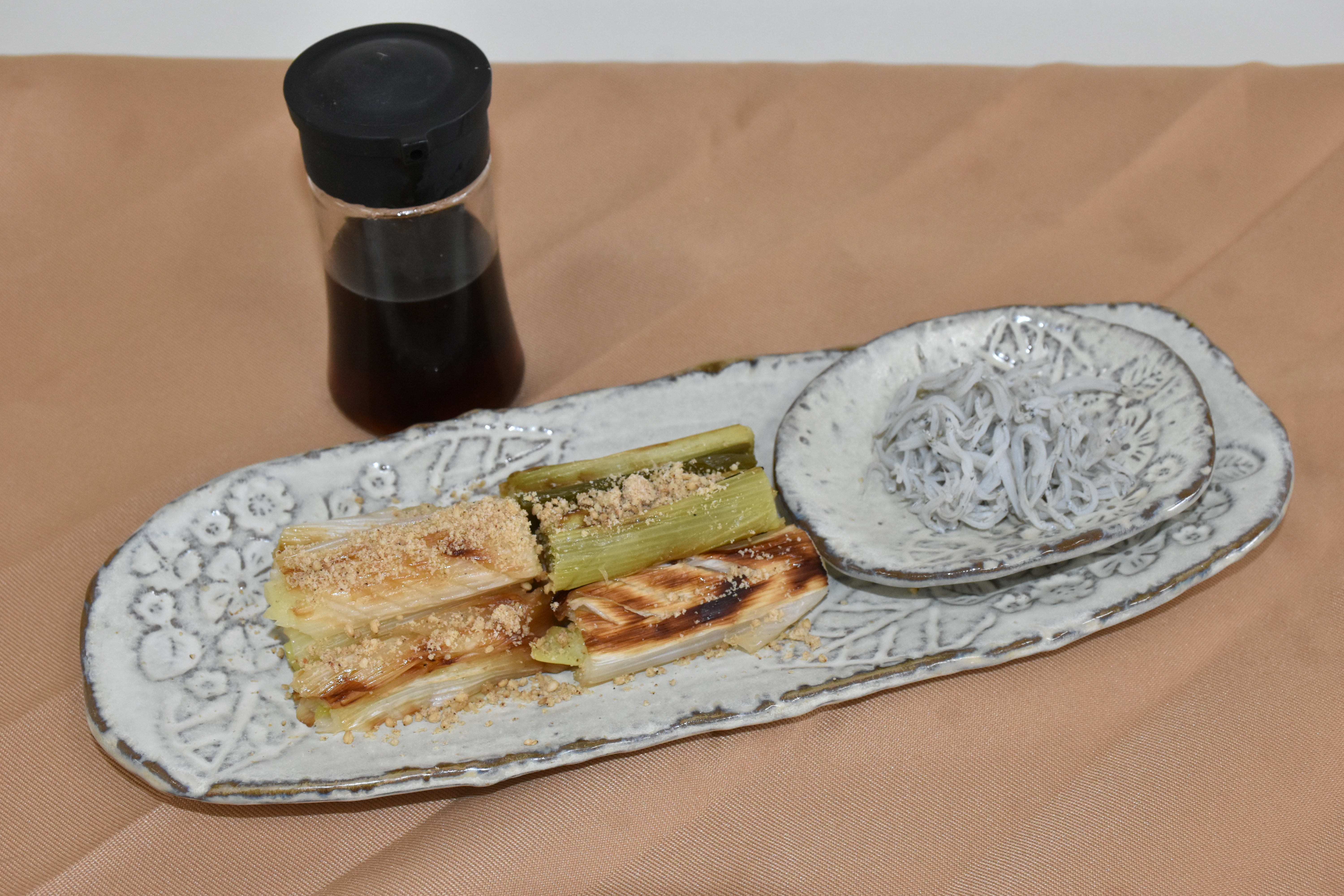 ➊ネギに切れ目を入れて、食べやすい大きさに切ってフライパンで焼く